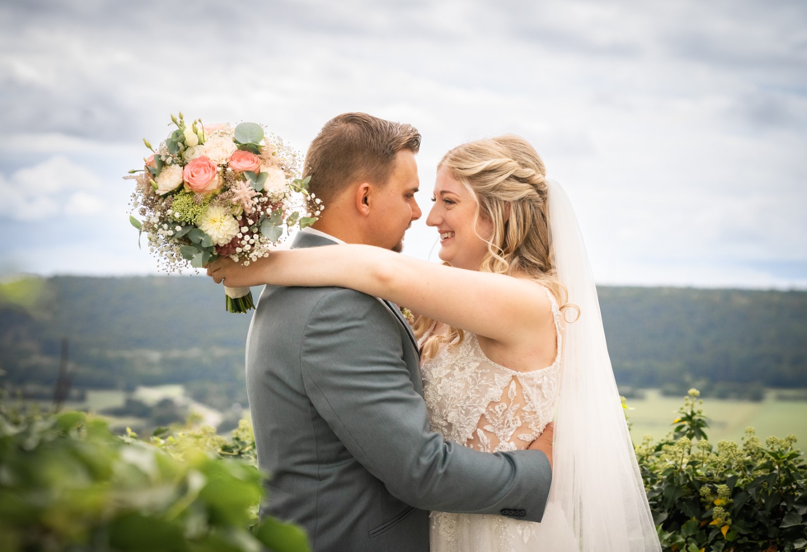 Beide: Um halb 11 starteten wir mit dem Brautpaarshooting im Schloss Hirschberg mit unserer Fotografin Melanie Grabmann. Zur kirchlichen Trauung fuhren wir nach Zell. Unsere Hochzeitsfeier mit Sektempfang fand in Paulushofen beim Landgasthof Euringer statt.