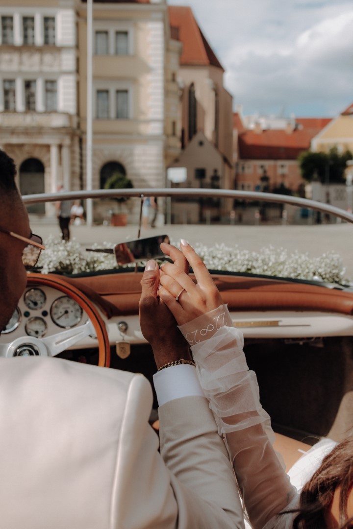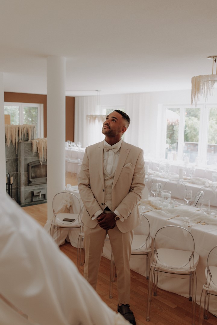 Daniel: Wir haben zusammen in unserem neuen Zuhause ausgeschlafen. Dieses war auch unsere Hochzeitslocation. Wir haben die letzten Details finalisiert und im Anschluss habe ich mit meinem besten Freund das Hochzeitsauto geholt. Das Auto war ein absoluter Traum und ein wahrer Hingucker. Als wir zurückgekommen sind, habe ich mich in meinen Hochzeitsanzug geworfen und dann auf Evelyn am Fuß der Treppe gewartet, damit wir unseren Firstlook machen konnten. Was soll ich sagen, Evelyn mit ihrer gesamten Aufmachung, vom Kleid über die Haare hin zu den kleinen Details, hat mich einfach umgehauen. Ich war fasziniert und den Tränen nahe. Nachdem wir ein paar Fotos gemacht haben, sind wir zum Standesamt in Ingolstadt gefahren und wurden dort bereits von unseren Gästen in Empfang genommen.