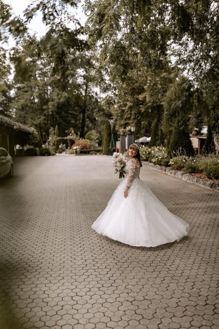 Nicole: Als ich mit meiner Mutter bei der Anprobe meines Brautkleids für die standesamtliche Hochzeit war, habe ich zufällig das Kleid für meine freie Trauung entdeckt. Insgesamt habe ich zwei Kleider anprobiert. Allerdings habe ich mich für das erste entschieden, da ich mich sofort in das traumhafte Kleid verliebt hatte.