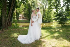 Das dritte Kleid, das Amelie bei Herzzauber in Lenting anprobierte, war ihres. „Ich trage eher Jeans und T-Shirt, statt Kleidchen und Röckchen, daher hatte ich Angst, gar keines zu finden.“ Das Kleid, das es schlussendlich werden sollte, hatte sie in der Vorauswahl eigentlich bereits ausgeschlossen. „Aber sie haben es mir trotzdem untergejubelt. Als ich hineinschlüpfte, war sofort klar: Genau das ist es, genau so möchte ich heiraten.“ Das und kein anderes. Ein Boho-/Vintagekleid, hochgeschlossen, mit kurzen Ärmelchen, am Rücken minimal ausgeschnitten. „Eigentlich komplett anders, wie ich es mir ursprünglich vorgestellt hatte, aber es war perfekt.“ Auch Julian war begeistert von seinem Anzug, den er bei Moser Männermode in Neuburg gekauft hatte.