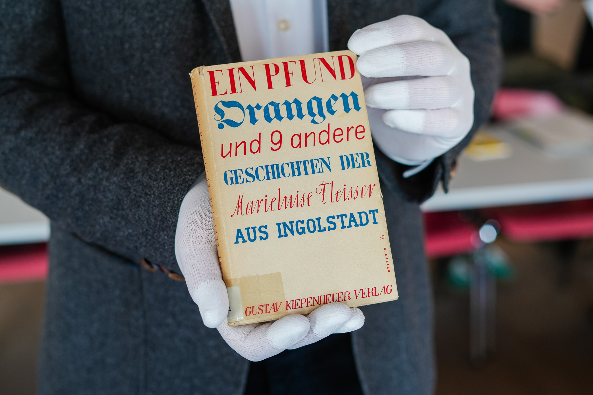 Kulturreferent Marc Grandmontagne hält mit Schutzhandschuhen eine Erstausgabe von "Ein Pfund Orangen". Gestaltung: Georg Salter | Foto: Birkl