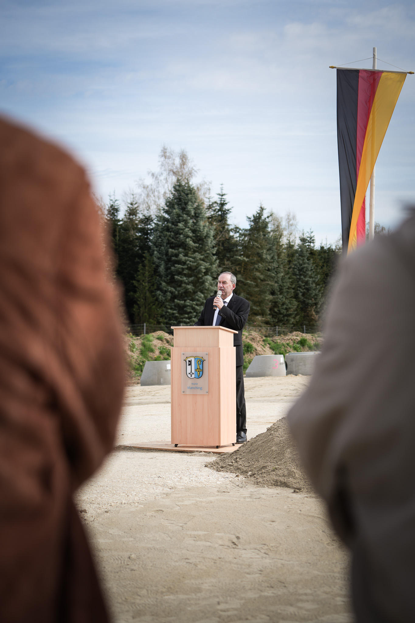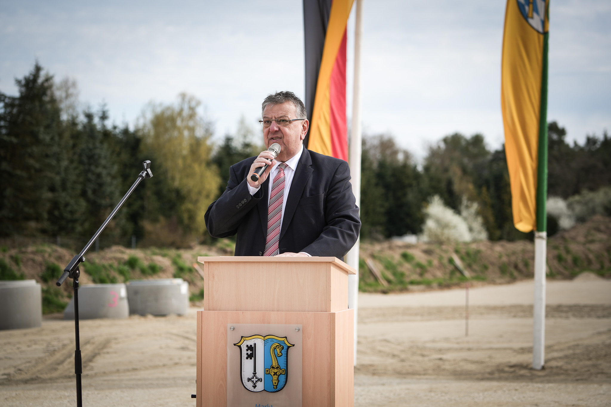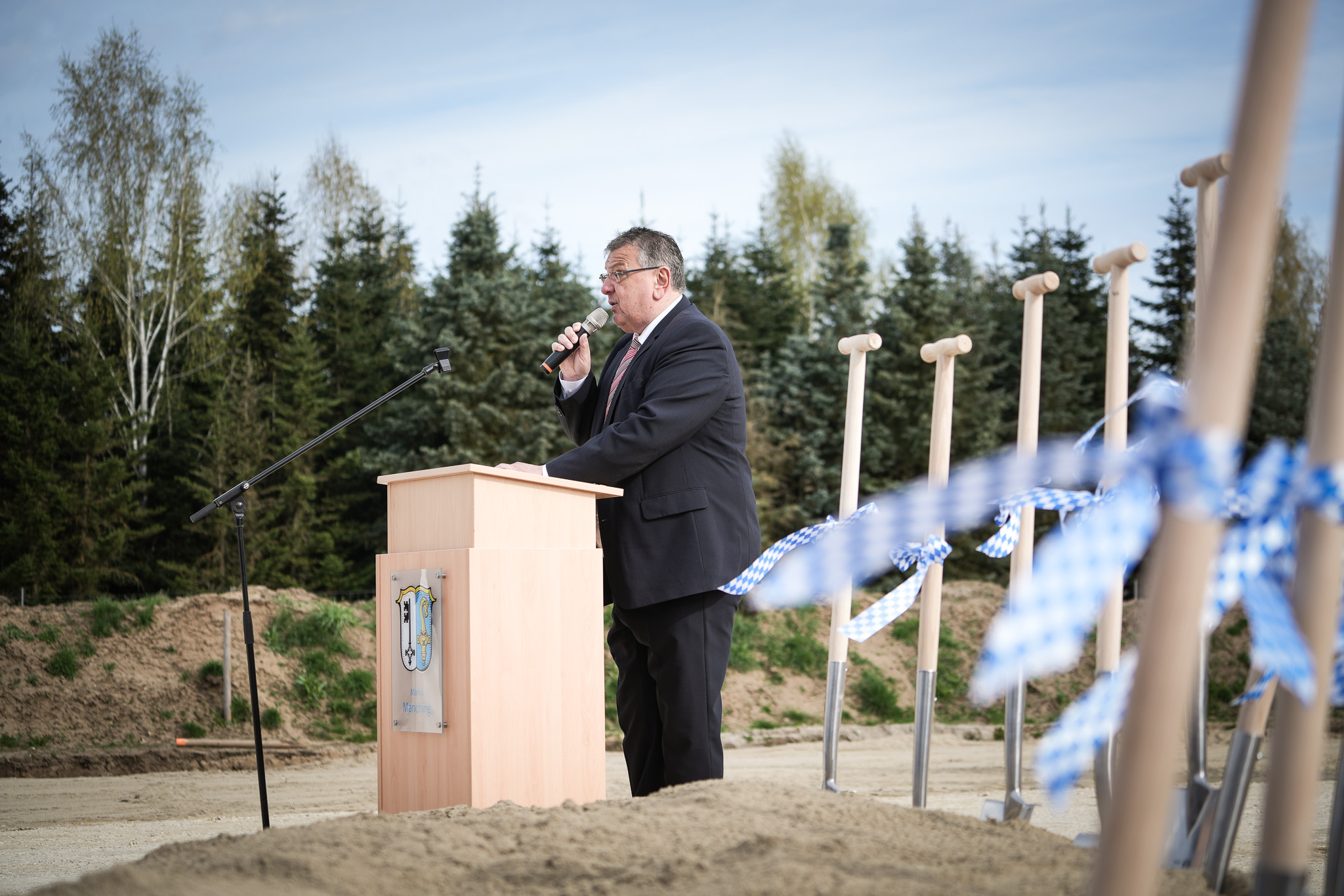 Vor dem offiziellen Spatenstich tritt Landrat Albert Gürtner ans Mikro. Auch er sieht im Technologiepark ein „klares Zeichen für die Zukunft“. Seine Rede in Kurzform: Vor allem in Zeiten einer schwächelnden Automobilindustrie schade ein zweites Standbein nicht.