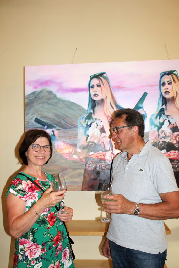 Die Sonne und die Künstlerin strahlten an diesem Tag um die Wette. Bei hochsommerlichen Temperaturen begrüßte Claudia Klimek ihre Gäste zur Vernissage ihrer Ausstellung „Farben & Formen“ in der Ludwigstraße. Von 28. Juni bis 13. Juli rückte hier auf den Leinwänden die Frau in den Fokus. Bronzegüsse einer Katze und eines Storchs zeigten, dass Klimek auch plastische Arbeiten stilvoll umzusetzen weiß. Die gezeigten Werke entstanden über einen Zeitraum von rund 15 Jahren. Doch war die Manchinger Künstlerin auch selbst zufrieden? Durchaus, war in einem kurzen Gespräch auf der Vernissage zu erfahren. Klar, dass – abseits ihrer Werke – auch sie an diesem Abend besonders im Fokus stand und jeder Gast gerne ein paar Worte mit ihr wechseln wollte. Die Resonanz der Gäste, so Klimeks, aber auch unser eigener Eindruck: durchweg positiv.